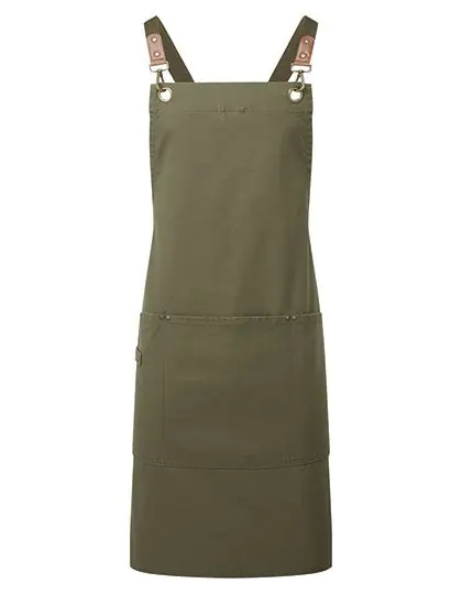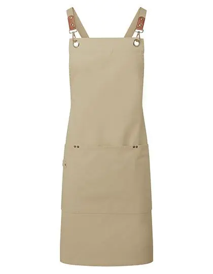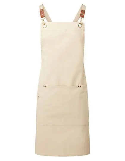 Zertifiziertes recyceltes Polyester | Schürze mit Kreuzrücken | Robustes und strapazierfähiges Canvas | Schnallen zur Sicherung der Bänder | Kunstlederdetail | Drei große aufgesetzte Taschen mit Nietendetail | Aufhänger aus dem gleichen Material | Ösen aus Rotguss/antikem Messing